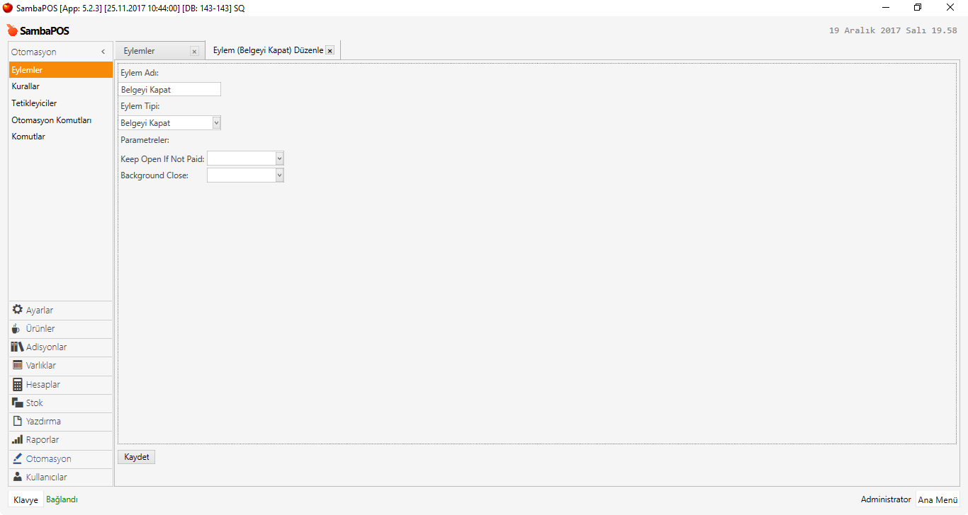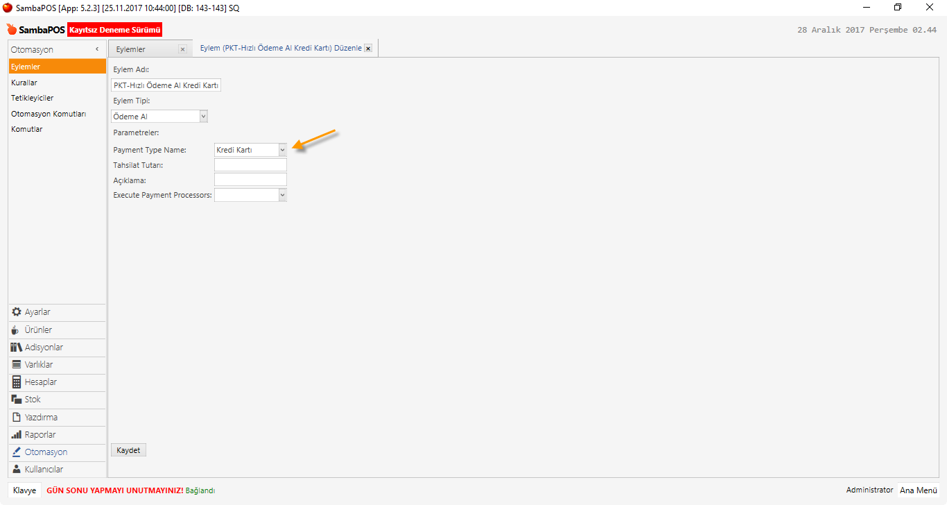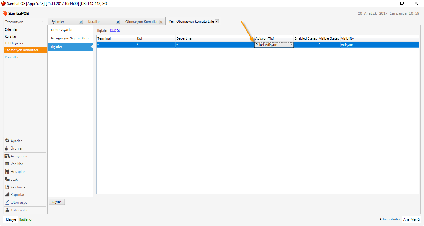 Yönetim > Otomasyon > Otomasyon Komutları > Silinecek Adisyon Tipleri