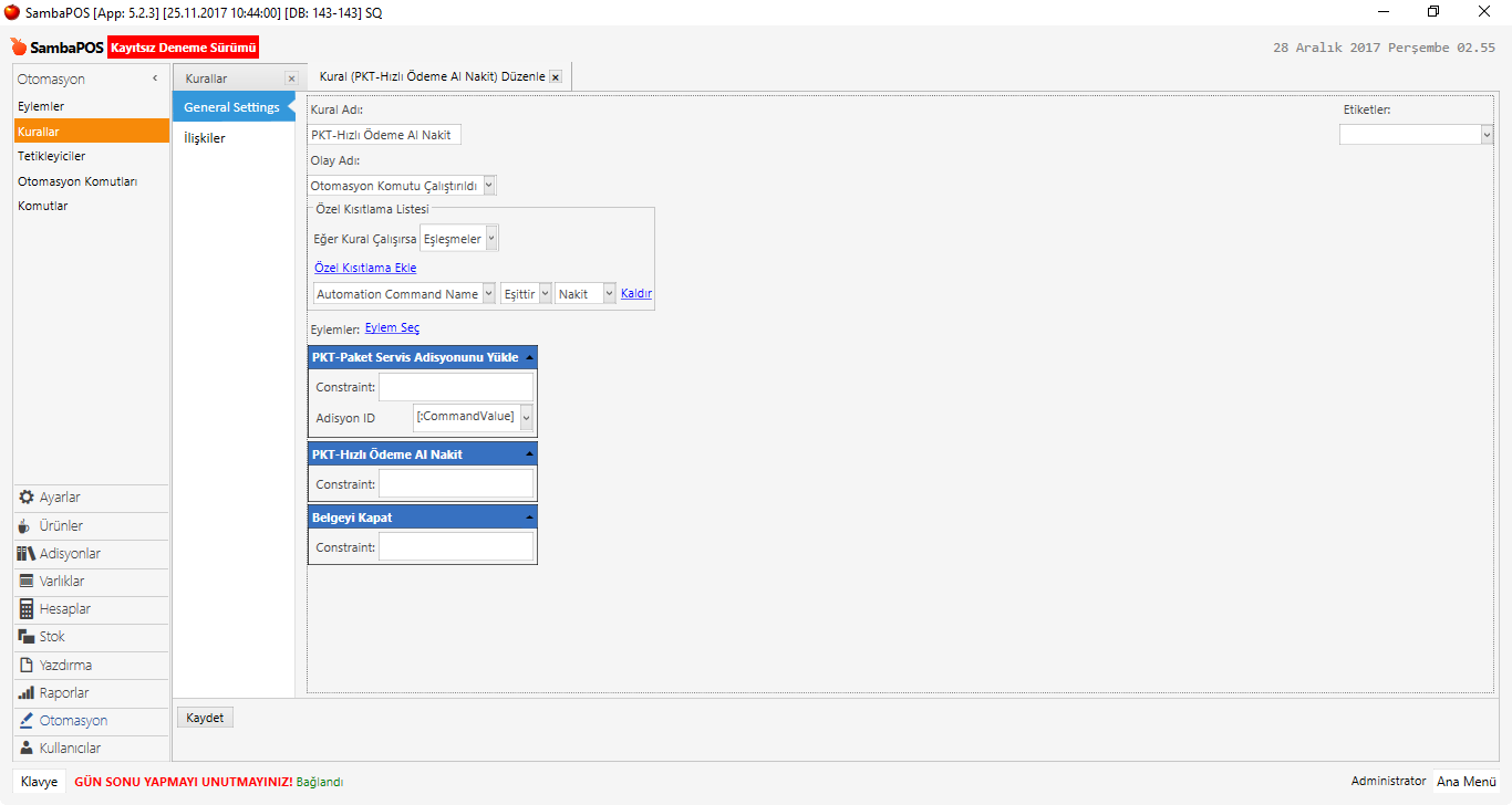 Aşağıdaki başlıklarda hazırlanan varlık, adisyon ve otomasyonlar silinerek SambaPOS’tan kaldırılır.