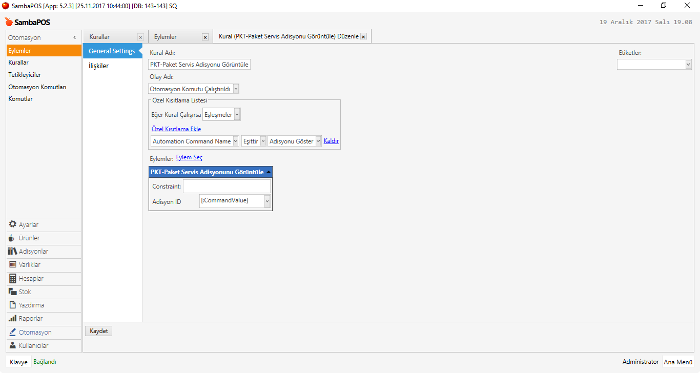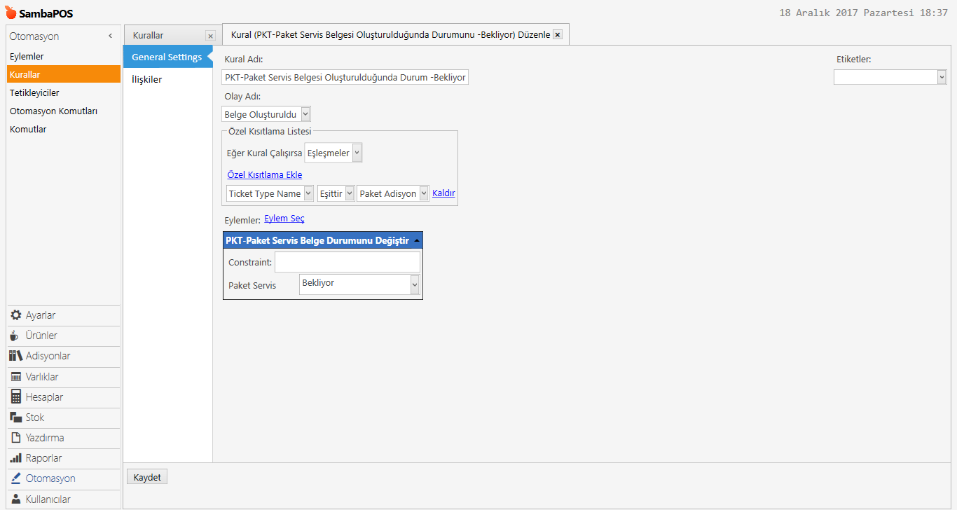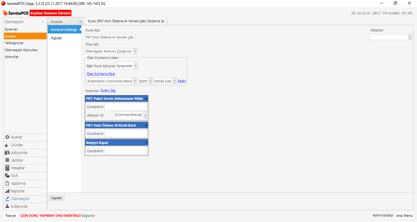 Özel Kısıtlama Ekle: Automation Command Name | Eşittir | Yemek Çeki