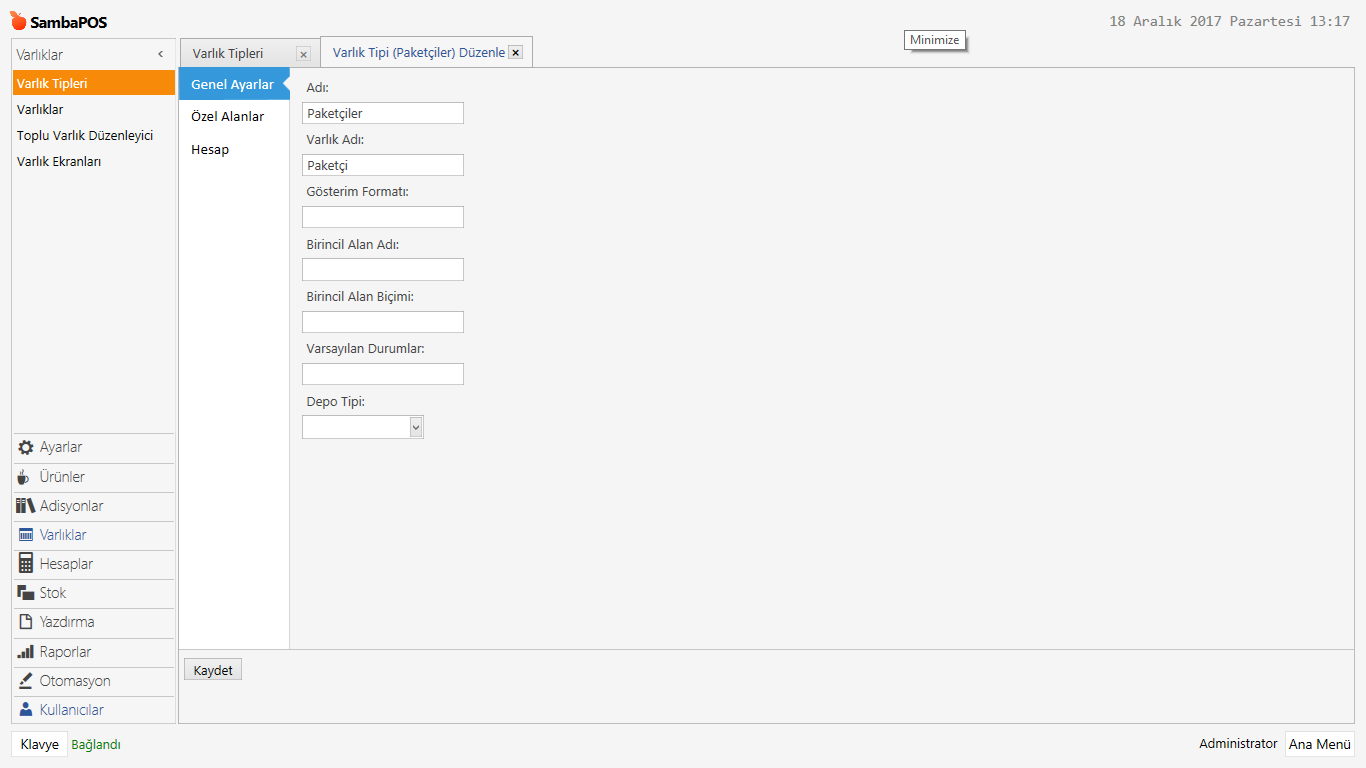 Yönetim > Varlıklar > Varlık Tipleri > Varlık Tipi Ekle