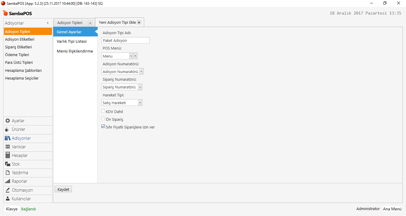 Not: Adisyon Tipi tanımlandıktan sonra SambaPOS’tan logout / login (çıkış / giriş) yapılmalıdır.