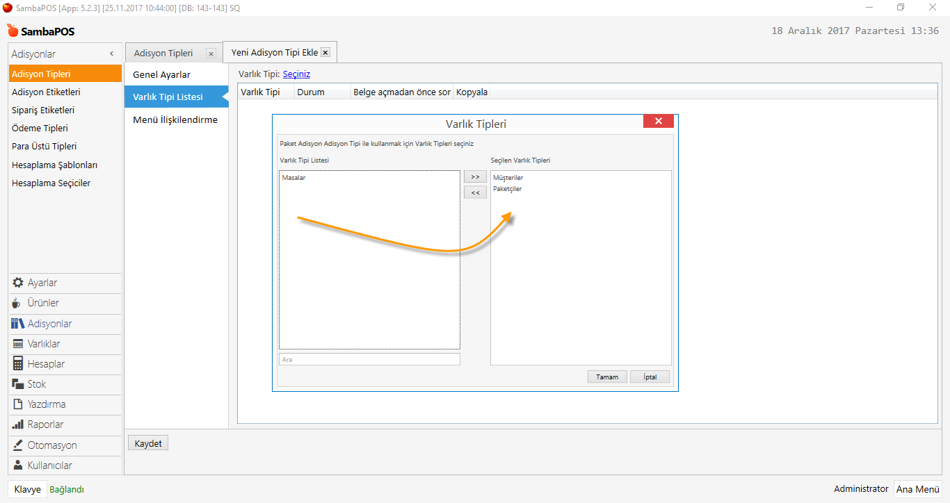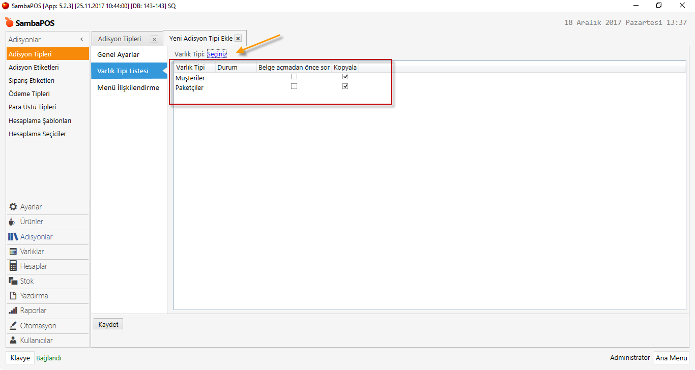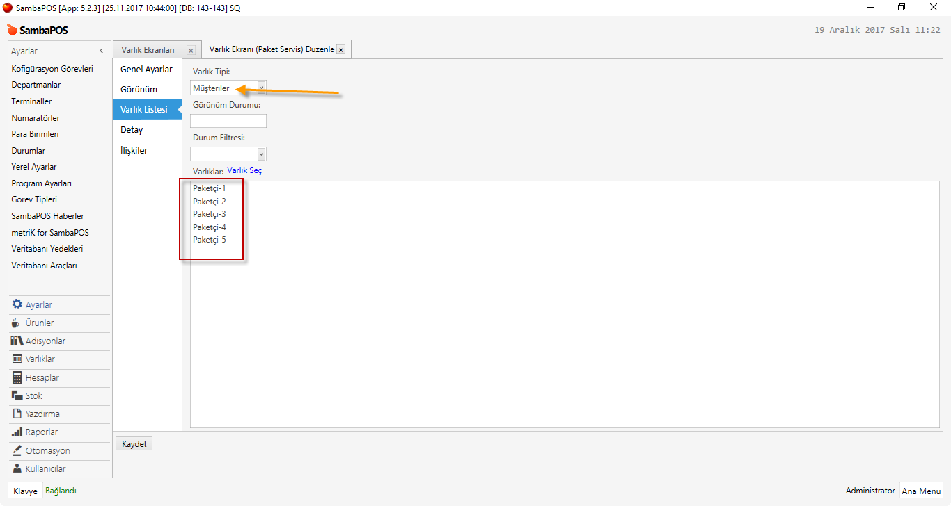 Varlık Tipi Listesi Sekmesi: Varlık tipi listesi sekmesinde yer alan seçiniz linkine tıklanarak müşteri ve paketçiler Varlık Tipleri seçilir.