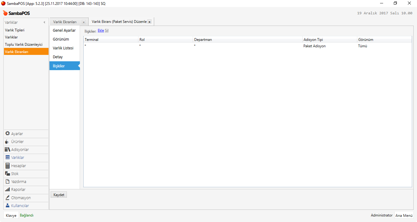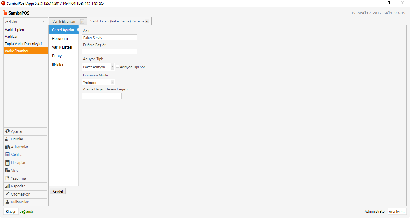 6.1. Paket Servis Varlık Ekranı Tanımlanması (Yönetim)