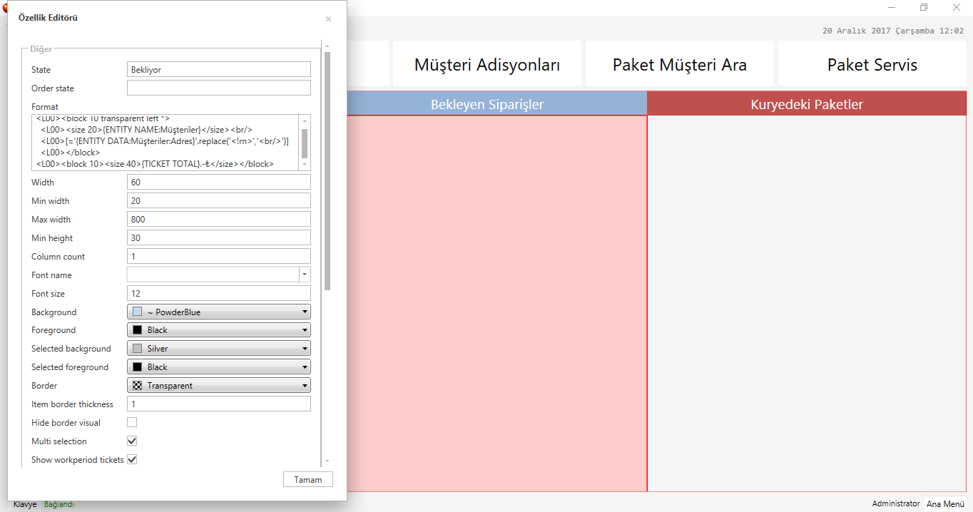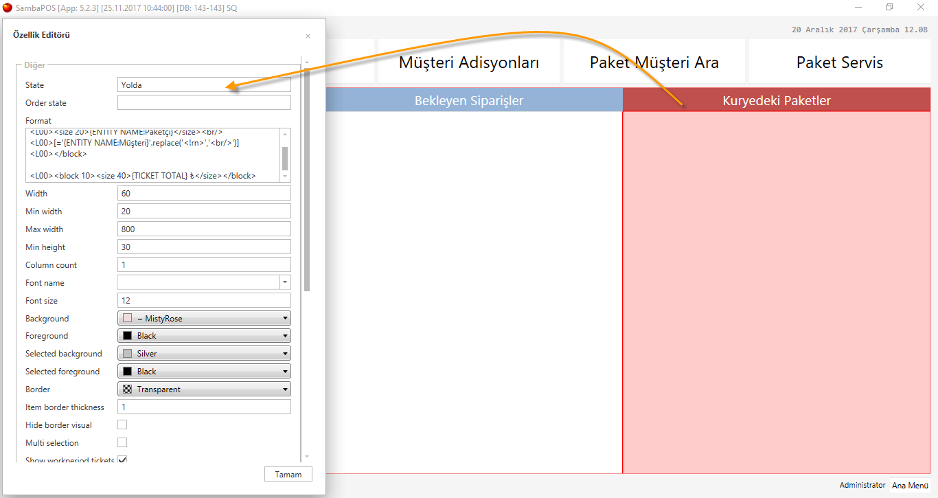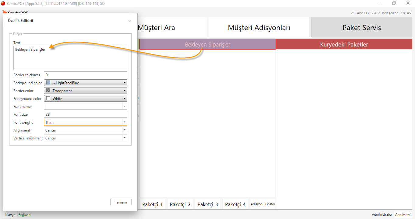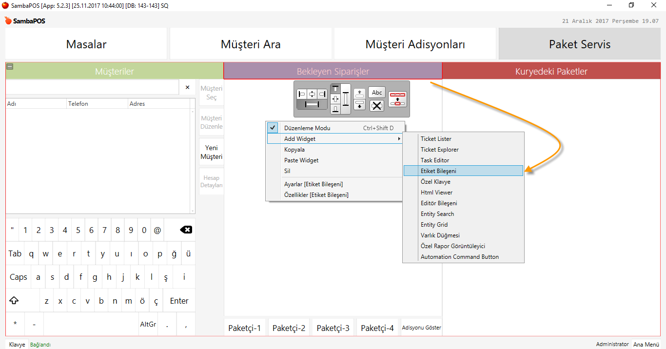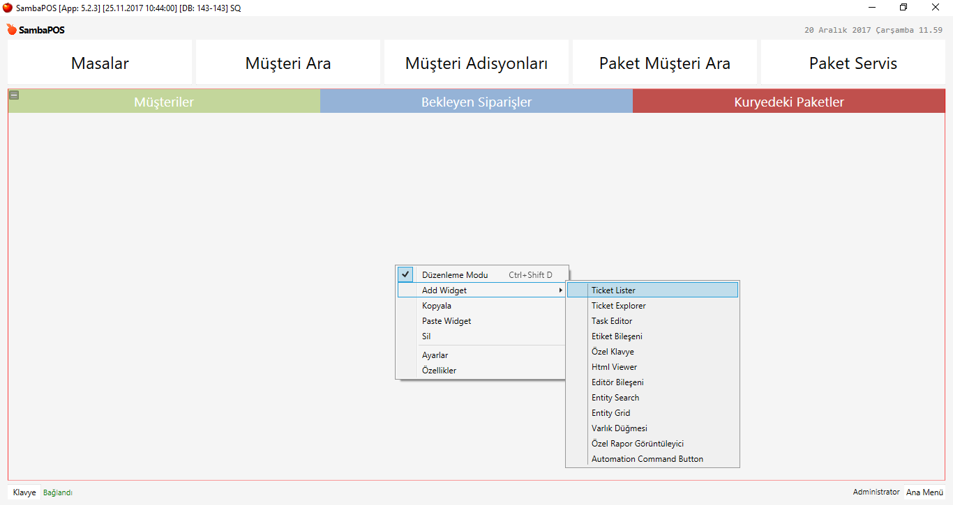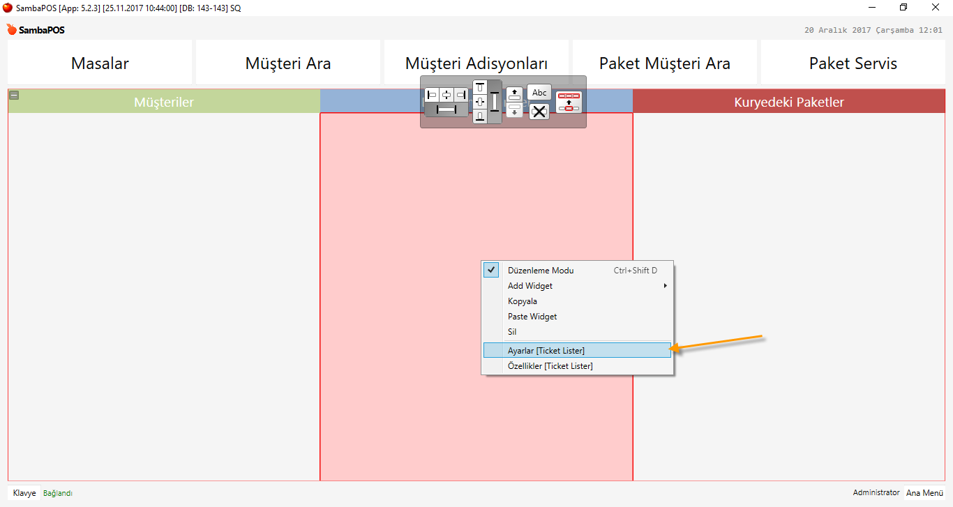 Ana Menü > POS Ekranı > Paket Servis Varlık Ekranı > Widget Düzenleme Modu (Fare Sağ Tıklanarak) > Kuryedeki Paketler Widget Ayarlar – Ticket Lister
