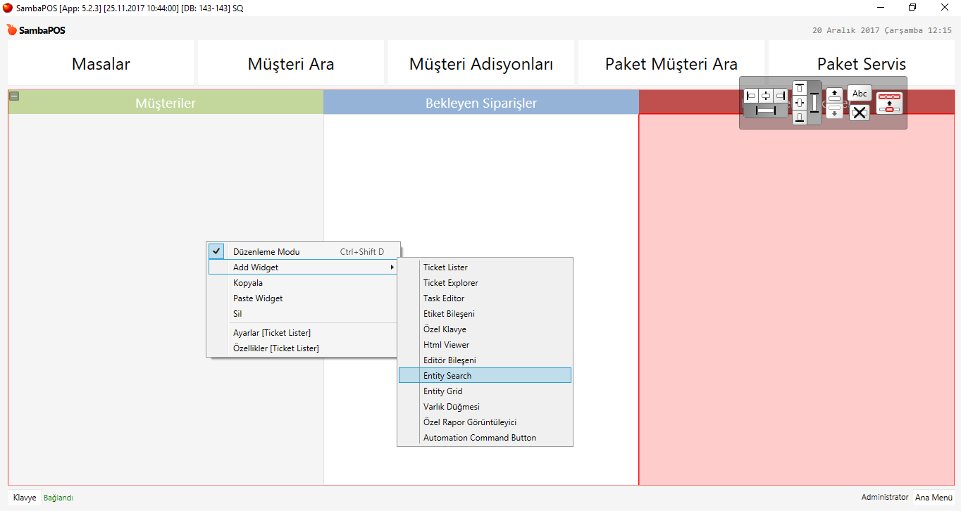 Düzenleme modu: Farenin sağ tuşuna tıklanır ve Add Widget > Entity Search tıklanarak ekrana pencere eklenir. Fareyle sürüklenerek ve düzenleme aracı kullanılarak ekrandaki yeri konumlandırılır.
