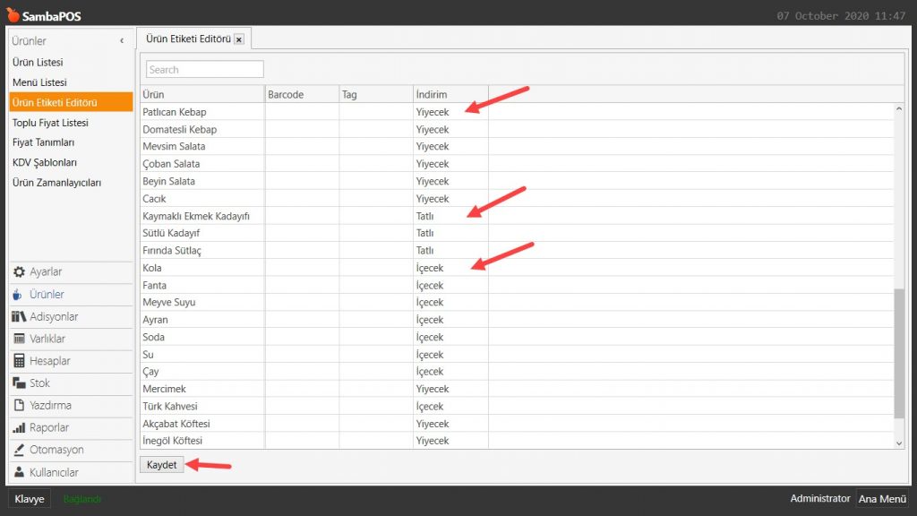 Bu dokümanda istenilen ürünlere Ürün Etiketi bazında nasıl indirim yapılabileceği anlatılmaktadır. Yiyecekler için 20%, İçecekler için 30% ve Tatlılar için 50% indirim uygulanacaktır.