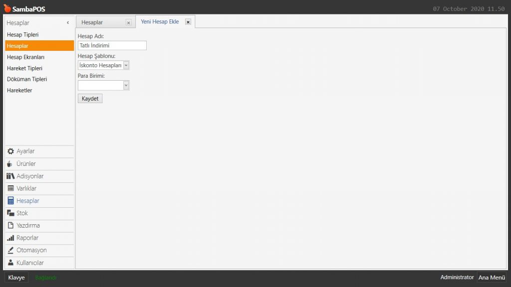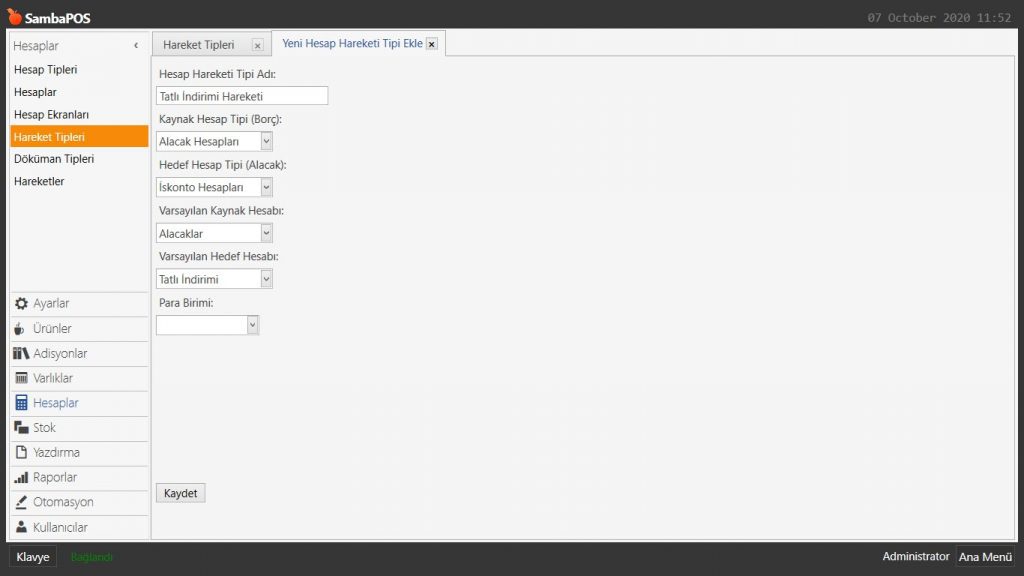 Ana Menü > Yönetim > Hesaplar > Hareket Tipleri > Burada Hareket Tipi Ekle‘ye tıklayın.