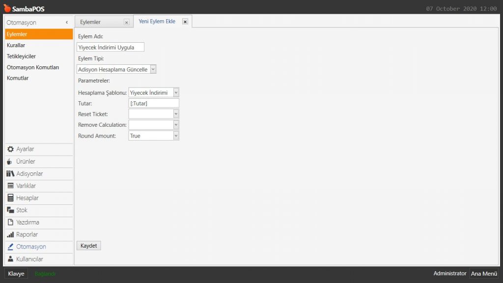 Eylem Tipi: Adisyon Hesaplama Güncelle