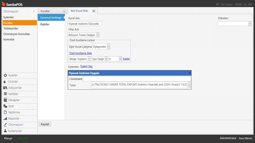 7.1. Yiyecek İndirimi Kuralı Ekleme