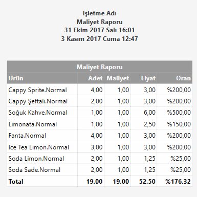 SambaPOS dönemsel ağırlıklı (Seçilen tarihler aralığına göre) maliyet hesaplaması yapar. Seçilen tarih aralıklarındaki Mevcut envanter, Maliyet, Satış fiyatı ve Maliyet yüzdesi sütununda raporlanır.