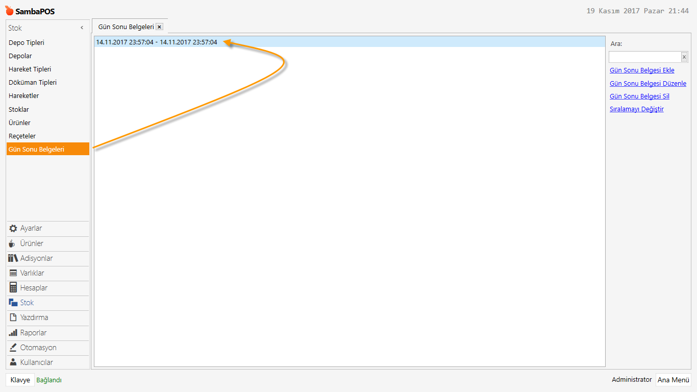 GünSonu yapıldıktan sonra Yönetim > Stok > GünSonu Belgeleri açılır.