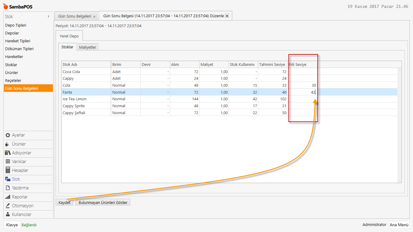 Her gün sonu işlemi stok kayıtlarında da gün sonu belgeleri oluşturur. Bu GünBaşı – GünSonu Belgesi aralıklarında hareket gören stok miktarları görüntülenir. Sayım yapmak ve fiili stok miktarlarını girmek için en son yapılan GünSonu Belgesi açılır.