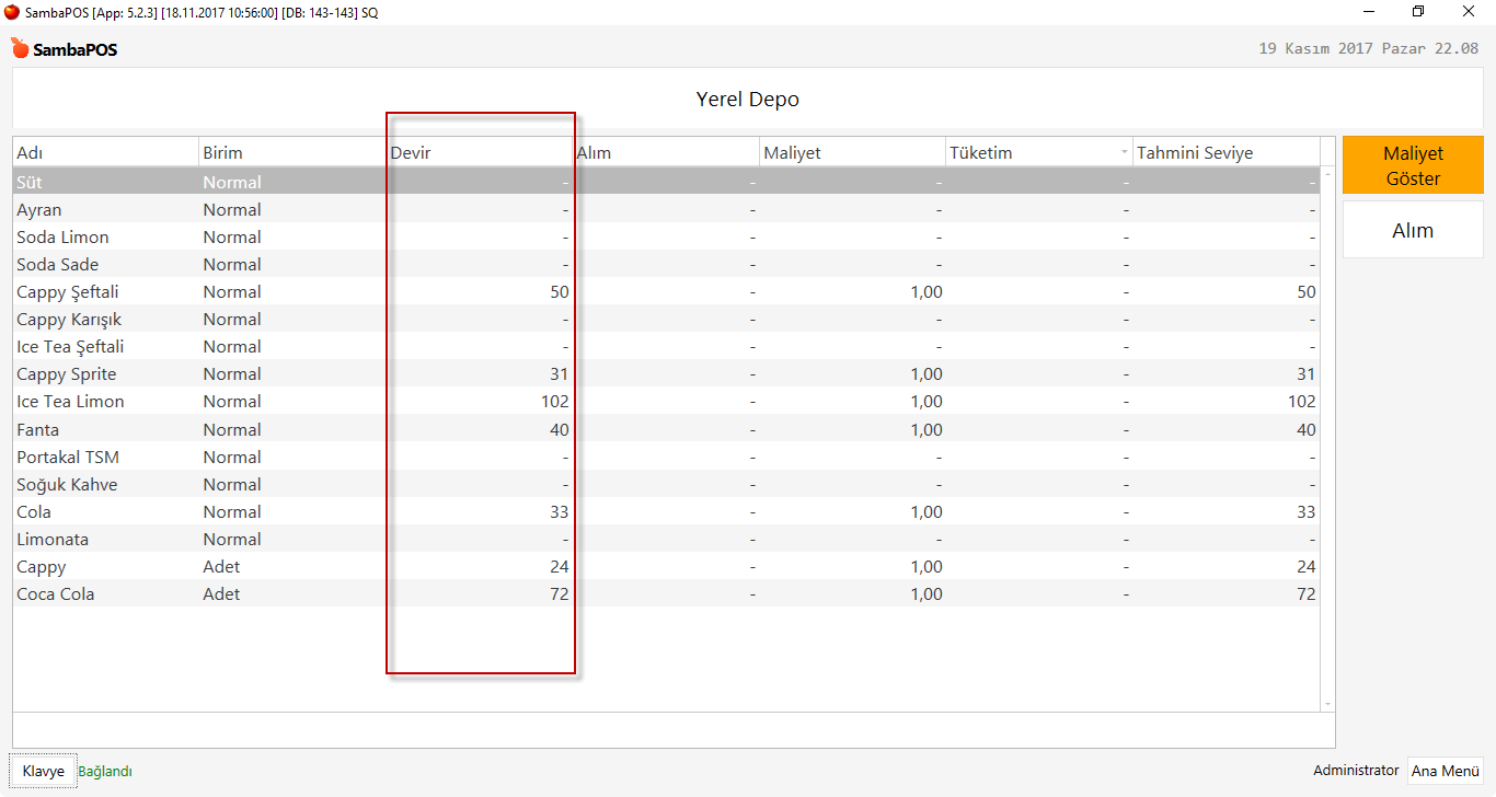 Sayım sonucu fiili stok miktarları girilerek kaydedildikten sonra yapılan ilk GünBaşı işleminden sonra fiili seviye miktarları devir sütununda görünür. Stoklar bu miktarlardan düşmeye başlar.