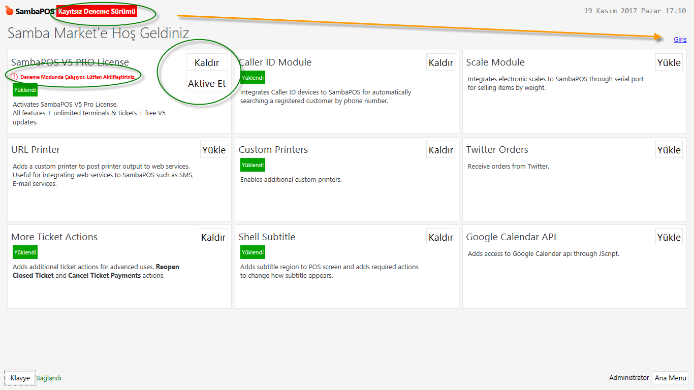 SambaPOS Lisansı aktif hale getirilmediğinde sol üstte Kayıtsız Deneme Sürümü yazar. Aynı zamanda 500 adisyon sonra program sağ alt köşeden uyarı Pop-Up’ı gösterir ve sipariş almayı engeller.