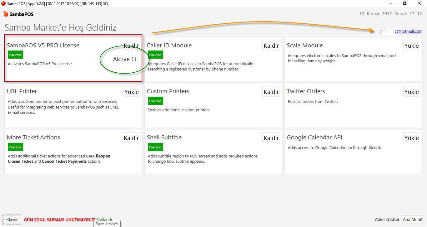 Tamam butonuna tıklandıktan sonra e-posta adresi ekranda görünecektir. Lisans modülünde Aktive Et butonu belirgin hale gelecektir. Aktive Et butonuna tıklanır.