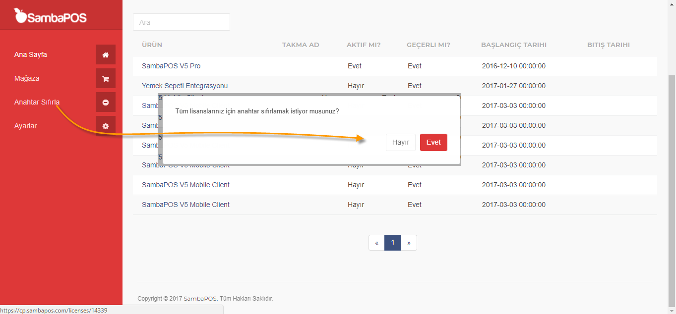 Anahtar Sıfırlama daha önce lisansa atanmış bilgileri temizler ve yeniden aktif hale getirildiğinde yeni bilgiler geçerli olur. Bu işlem için cp.sambapos.com adresinden kullanıcı e-posta ve geçerli şifre ile giriş yapılır.